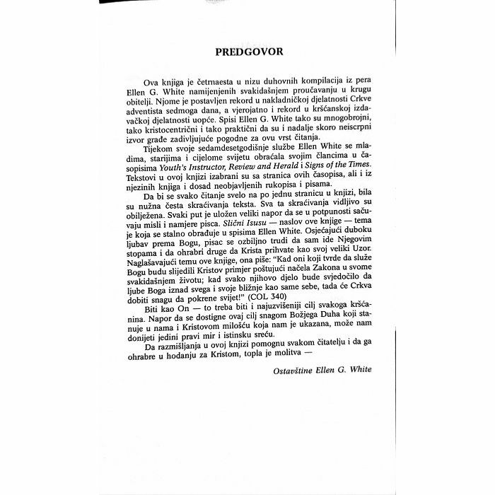 Ova knjiga je četrnaesta u nizu duhovnih kompilacija iz pera Ellen G. White namijenjenih svakidašnjem proučavanju u krugu obitelji. Njome je postavljen rekord u nakladničkoj djelatnosti Crkve adventista sedmoga dana, a vjerojatno i rekord u kršćanskoj izda-vačkoj djelatnosti uopće. Spisi Ellen G. White tako su mnogobrojni, tako kristocentrični i tako praktični da su i nadalje skoro neiscrpni izvor grade zadivljujuće pogodne za ovu vrst čitanja. Tijekom svoje sedamdesetgodišnje službe Ellen White se mla-dima, starijima i cijelome svijetu obraćala svojim člancima u ča-sopisima Youth's Instructor, Review and Herald i Signs of the Times. Tekstovi u ovoj knjizi izabrani su sa stranica ovih časopisa, ali i iz njezinih knjiga i dosad neobjavljenih rukopisa i pisama. tema Da bi se svako čitanje svelo na po jednu stranicu u knjizi, bila su nužna česta skraćivanja teksta. Sva ta skraćivanja vidljivo su obilježena. Svaki put je uložen veliki napor da se u potpunosti saču-vaju misli i namjere pisca. Slični Isusu naslov ove knjige je koja se stalno obrađuje u spisima Ellen White. Osjećajući duboku ljubav prema Bogu, pisac se ozbiljno trudi da sam ide Njegovim stopama i da ohrabri druge da Krista prihvate kao svoj veliki Uzor. Naglašavajući temu ove knjige, ona piše: "Kad oni koji tvrde da služe Bogu budu slijedili Kristov primjer poštujući načela Zakona u svome svakidašnjem životu; kad svako njihovo djelo bude svjedočilo da ljube Boga iznad svega i svoje bližnje kao same sebe, tada će Crkva dobiti snagu da pokrene svijet!" (COL 340) Biti kao On to treba biti i najuzvišeniji cilj svakoga kršća-nina. Napor da se dostigne ovaj cilj snagom Božjega Duha koji sta-nuje u nama i Kristovom milošću koja nam je ukazana, može nam donijeti jedini pravi mir i istinsku sreću. Da razmišljanja u ovoj knjizi pomognu svakom čitatelju i da ga ohrabre u hodanju za Kristom, topla je molitva Ostavštine Ellen G. White