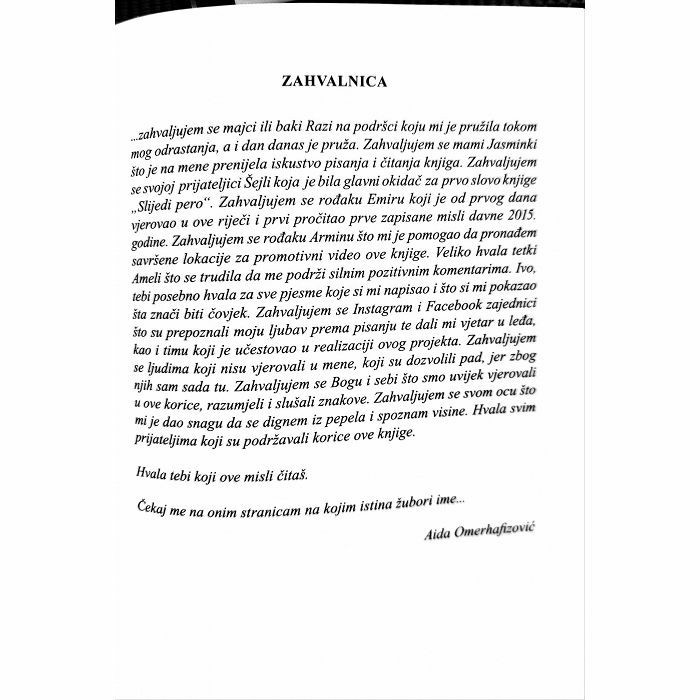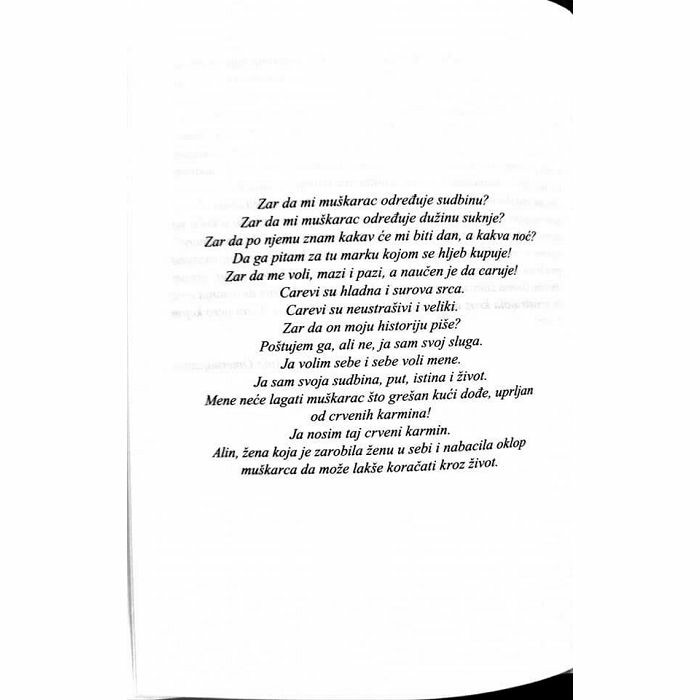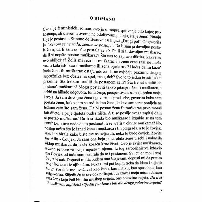 Ovo nije feministički roman, ovo je samopreispitivanje bilo kojeg psi-hostanja, ali u svemu ovome ne odolijevam pitanju, šta je žena? Pitanju koje je postavila Simone de Beauvoir u knjizi „Drugi pol“. Odgovorila je: "Ženom se ne rađa, ženom se postaje". Da li sam ja dovoljno posta-la žena, da li sam uopšte postala žena? Da li si ti dovoljno muškarac, da li si uopšte postao muškarac? Šta nas to zapravo diktira, kakva su ovo obilježja? Želiš mi reći da muškarac ili žena crne rase ne može voziti kola isto kao i muškarac ili žena bijele rase? Hoćeš da mi kažeš kada žena ili muškarac ostaju udovci da ne osjećaju prazninu drugog supružnika bez obzira na spol, rasu, dob? Sve je to jedan te isti balon praznine. Šta trebam uraditi da postanem žena? Šta trebaš uraditi da postaneš muškarac? Mogu postaviti takvo pitanje i ženi i muškarcu, i dobiti na hiljade odgovora, tumačenja, perspektiva, a samo je jedna moja, i tvoja. Ja sam dovoljno žena i govorim ispred sebe, govorim kako sam postala žena, kako sam se rodila kao žena, kakav sam teret ponijela na leđima zato što sam žena. Da bi postao žena ili muškarac prvo moraš biti dijete, a prije djeteta budeš ništa. A ti se poslije svega zapitaj da li si postao muškarac? Da li si ikada bio muškarac i izgubio se na tom putu? Da li ima nade da to postaneš ili se vratiš u okvire muškarca? No, postoji nešto što je iznad žene i muškarca i tih pregrada, a to je čovjek. Ako bih birala kako biste me oslovljavali, neka to bude čovjek. Zovite me Alin - Čovjek. Ja sam ona koja je zarobila ženu u sebi i nabacila oklop muškarca da lakše korača kroz život. Ovo je svijet muškaraca, a žene se bore za svoje mjesto u njemu. Iz tog zarobljeništva izbavio me Čovjek od tada sam izabrala da to i postanem. Svijet je i moj i tvoj. Svijet je naš. Dopusti mi da budem ono što jesam, dopusti mi da pratim tvoje korake i iz njih učim. Pokaži mi put kojim treba da idem i slijedit ću ga sve dok me uvažavaš kao ženu, kao majku, kao sposobnu, kao odgovornu. Slijedit ću te sve dok poštuješ i uvažavaš moju misao. Ja sam ona žena koja želi biti dio muškog svijeta, one polovine svijeta. Da li si ti muškarac koji želiš slijediti put žene i biti dio druge polovine svijeta?