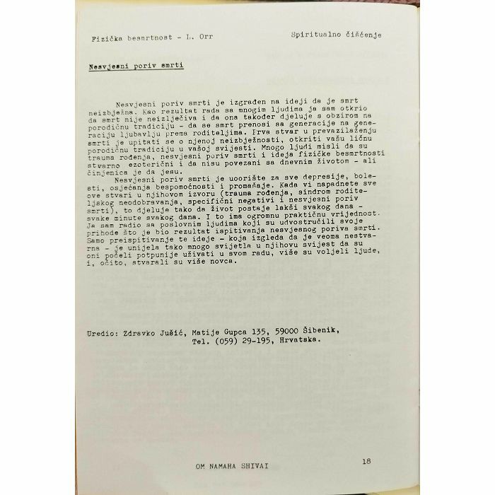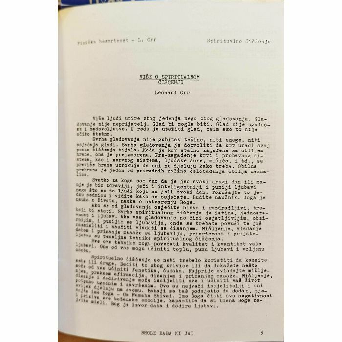 Više ljudi umire zbog jedenja nego zbog gladovanja. Gla-dovanje nije neprijatelj. Glad bi mogla biti. Glad nije ugodno-et i zadovoljstvo. U redu je utažiti glad, osim ako to nije očito štetno. Svrha gladovanja nije gubitak težine, niti snage, niti osjećaja gladi. Svrha gladovanja je dozvoliti da krv uradi svoj posao čiščenja tijela. Kada je krv stalno zagađena sa obiljem brane, ons je preizmorena. Pre-zagađenje krvi i probavnog si-stems, kao i nervnog sistema, ljudske aure, mišića, i td., sa previše hrane uzrokuje da oni ne djeluju kako treba. Obilna prehrana je jedan od prirodnih načina oslobađanja obilja nezna-lics. Svatko za koga sam čuo da je jeo svaki drugi dan ili ma-nje je bio zdraviji, zdraviji, jači i inteligentniji i puniji ljubavi nego što su to ljudi koji su jeli svaki dan. Pokušajte to je-dnu sedmicu i vidite kako se osjećate. Budite naučnik. Joga je nauke o životu, nauka o ostvarenju Boga. Ako se od gladovanja osjećate nisko i razdražljivi, tre-beli bi stati. Svrha spiritualnog čišćenja je istina, jednosta-vnost i ljubav. Ako vas gladovanje ne čini osjetljivijim, obzi-mijim, i punijim sa ljubavlju, onda se trebate povući te još reamieliti i naučiti vladati sa disanjem. Mišljenje, vladanje dehom i primenje masaže sa ljubavlju, privrženost i prijate- ljstvo su temeljne tehnike spiritualnog čišćenja. Sve ove tehnike mogu povećati kvalitet i kvantitet vaše ljubavi. One od vas mogu učiniti toplu, punu ljubavi i voljenu osobu. Spirituelno čišćenje se nebi trebalo koristiti da kaznite sebe 111 druge. Eaditi to zbog krivice ili da dokažete nešto acže od vas učiniti fanatika, čudaka. Najprije ovladajte mišlje ajem, preksom afirmacija, disanjem i primanjem masaže. Mišljenje, disanje i dodirivanje može iscijeliti sve i učiniti vaš život potpuno ugodnim i savršenia. Ovo su najveći iscjelitelji i oni wote ime Boga O Rawan Shival. Ime Boga čisti svu negativnost uvijek djeluju na svemu. Babaji me baš podsjetio da dodam, pje-prisive ave božanske emocije. Zapamtite da su imena Boga na-jviše mieli. Bog je izvor daha i dodira ljubavi.