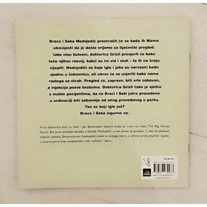 Braco i Seka Medvjedić prestrašit će se kada ih Mama obavijesti da je došlo vrijeme za liječnički pregled. Iako nisu bolesni, doktorica Grizli provjerit će kako teče njihov razvoj, kakvi su im vid i sluh – te ih na kraju cijepiti. Medvjedići se boje igle i jako su nervozni kada sjednu u čekaonicu, ali ubrzo će se uvjeriti kako nema razloga za strah. Pregled će, zapravo, biti vrlo zabavan, a injekcija posve bezbolna. Doktorica Grizli tako je vješta s malim pacijentima, da će Braci i Seki jutro provedeno u ordinaciji biti zabavnije od onog provedenog u parku. Tko se boji igle još? Braco i Seka sigurno ne.