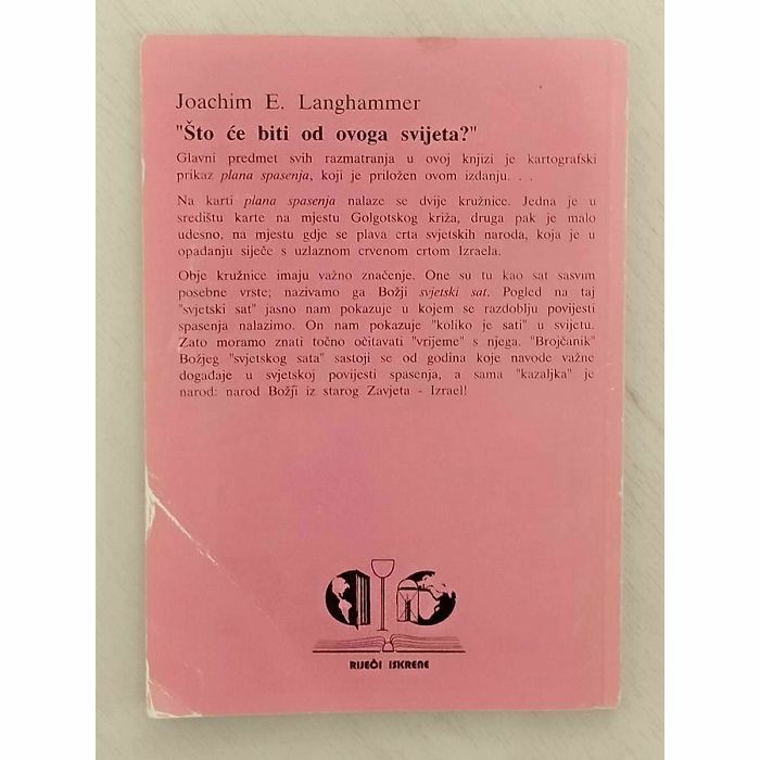 Joachim E. Langhammer "Što će biti od ovoga svijeta?" Glavni predmet svih razmatranja u ovoj knjizi je kartografski prikaz plana spasenja, koji je priložen ovom izdanju. Na karti plana spasenja nalaze se dvije kružnice. Jedna je u središtu karte na mjestu Golgotskog križa, druga pak je malo udesno, na mjestu gdje se plava crta svjetskih naroda, koja je u opadanju siječe s uzlaznom crvenom crtom Izraela. Obje kružnice imaju važno značenje. One su tu kao sat sasvim posebne vrste, nazivamo ga Božji svjetski sat. Pogled na taj "svjetski sat" jasno nam pokazuje u kojem se razdoblju povijesti spasenja nalazimo. On nam pokazuje "koliko je sati" u svijetu. Zato moramo znati točno očitavati "vrijeme" s njega. "Brojčanik" Božjeg "svjetskog sata" sastoji se od godina koje navode važne dogadaje u svjetskoj povijesti spasenja, a sama "kazaljka" je narod narod Božji iz starog Zavjeta Izrael!