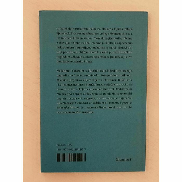 Nadahnuta složenim realitetima Iraka koje dobro poznaje, nagrađivana freelance novinarka i fotografkinja Émilienne Malfatto (izvještava diljem svijeta s fokusom na Bliski istok i Latinsku Ameriku) s istančanim nas osjećajem uvodi u zatvoreno društvo, kojim vlada muški autoritet i kodeks časti. Njezin prvi roman nadovezuje se na njezin reporterski uspjeh i osvaja više nagrada, među kojima je najznačajnija Prix Goncourt za debitantski roman. Tigrisova žalopojka blistava je i potresna lirska novela koja u sebi nosi snagu antičke tragedije.