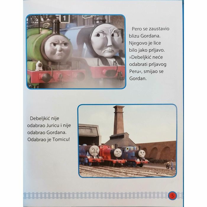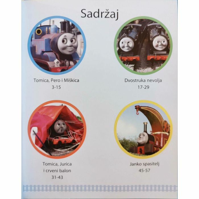 Zanimljiva slikovnica za sve ljubitelje malog vlakića Tomice i njegovih prijatelja. Ova prekrasno ilustrirana slikovnica sadrži četiri priče: Tomica, Pero i Miškica; Dvostruka nevolja; Tomica, Jurica i crveni balon te Janko spasitelj.