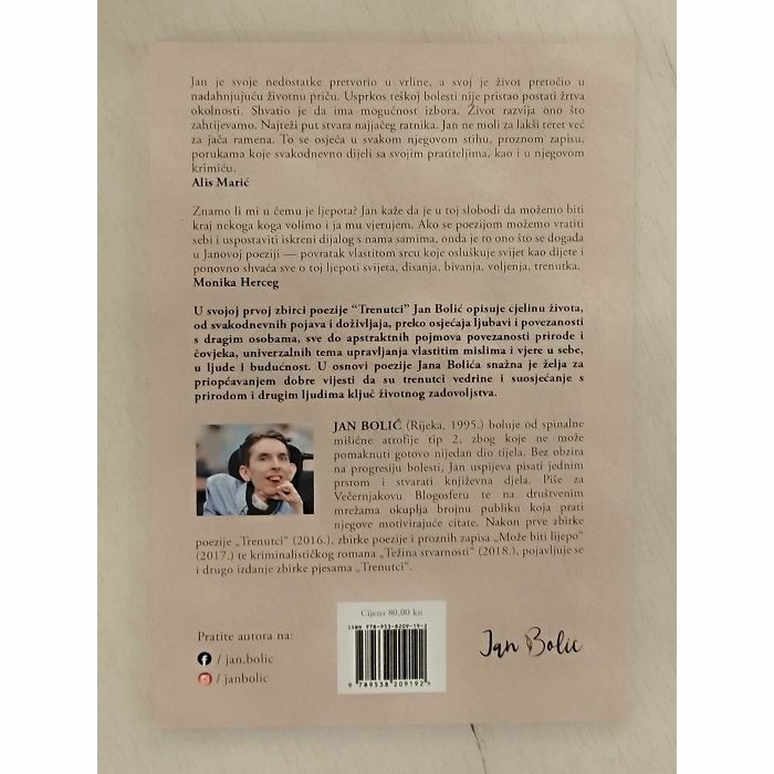 Pjesmama u svojoj prvoj zbirci poezije Trenutci Jan Bolić postigao je gradaciju od osjeta i opisa svakodnevnih pojava i doživljaja, preko osjećaja ljubavi i povezanosti s dragim osobama, sve do apstraktnih pojmova povezanosti prirode i čovjeka, univerzalnih tema gospodarenja vlastitim mislima i vjere u sebe, u ljude i budućnost. U zbirci poezije Trenutci pjesnik se obračunava s vlastitim odnosom prema svojoj bolesti koja donosi bol, strah i sputanost. Već po prvim pjesmama jasno je zašto je Jan Bolić mnogima postao uzor i inspiracija – u njegovu odnosu prema bolesti nema samosažaljenja i dramatiziranja, već samo kristalna mudrost prihvaćanja i pronalaženja vedrine u svakom trenutku. Nakon prvog izdanja iz 2016. godine, drugo izdanje zadržava predgovor Ines Ljubetić, u kojem su predstavljene četiri cjeline zbirke – Moji trenutci, Za sreću je potrebno malo, Ljubav, ljubav… i I još malo riječi. Jan Boliću svojim stihovima održava borbenost i pozitivan stav kojim želi ohrabriti i druge a nakon poglavlja posvećenog ljubavi, zbirka završava stihovima koje usmjeravaju prema rješenjima i većoj kvaliteti života. Poezija Jana Bolića je narativna, slobodnog stiha, jasnog i ekonomičnog izraza. U njeznoj je osnovi snažna želja za priopćavanjem dobre vijesti da su trenutci vedrine i suosjećanje s prirodom i drugim ljudima ključ životnog zadovoljstva. Monika Herceg, najnagrađivanija mlada pjesnikinja, za Janovu poeziju kaže: Ako se poezijom možemo vratiti sebi i uspostaviti iskren dijalog s nama samima, onda se to događa u Janovoj poeziji. Janovu zbirku preporučuje i Alis Marić na mreži Čitaj knjigu, koja za Janovu poeziju kaže: Jan je svoje nedostatke pretvorio u vrline a svoj život je pretočio u nadahnjujuću životnu priču.