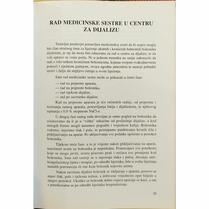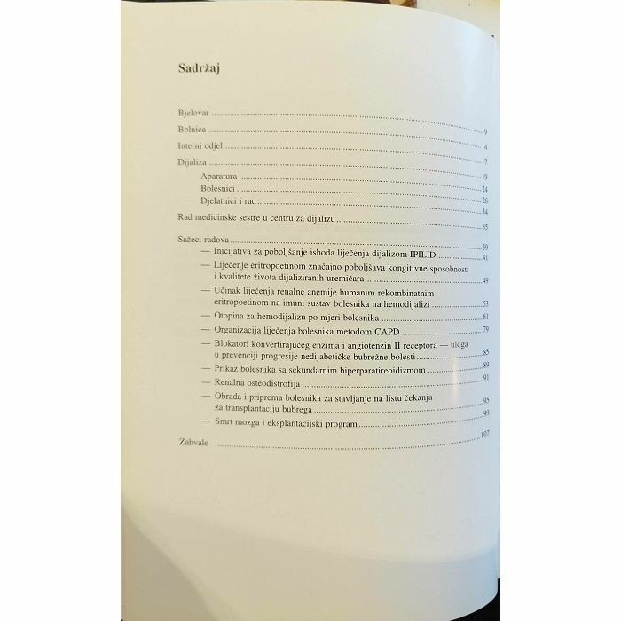Bjelovar Bolnica Interni odjel Dijaliza Aparatura Bolesnici Djelatnici i rad. Rad medicinske sestre u centru za dijalizu Sažeci radova. Inicijativa za poboljšanje ishoda liječenja dijalizom IPILID Liječenje eritropoetinom značajno poboljšava kongitivne sposobnosti i kvalitete života dijaliziranih uremičara Učinak liječenja renalne anemije humanim rekombinatnim eritropoetinom na imuni sustav bolesnika na hemodijalizi Otopina za hemodijalizu po mjeri bolesnika Organizacija liječenja bolesnika metodom CAPD Blokatori konvertirajućeg enzima i angiotenzin II receptora- uloga u prevenciji progresije nedijabetičke bubrežne bolesti.. Prikaz bolesnika sa sekundarnim hiperparatireoidizmom............ Renalna osteodistrofija Obrada i priprema bolesnika za stavljanje na listu čekanja za transplantaciju bubrega. Smrt mozga i eksplantacijski program. Zahvale