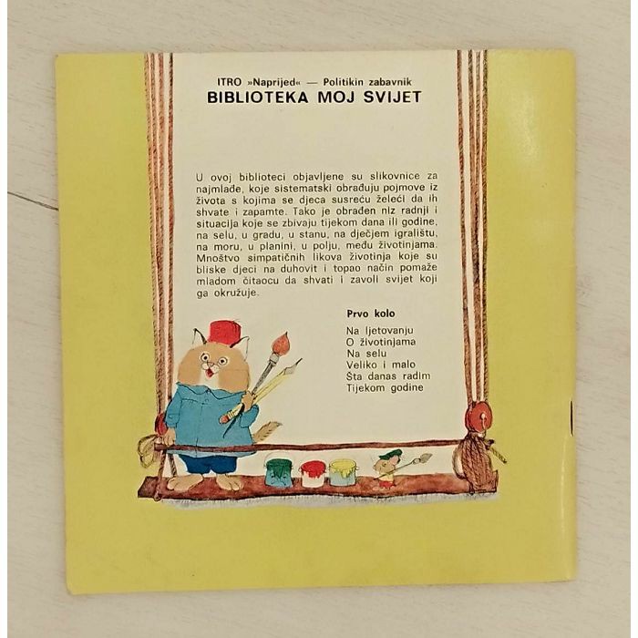 BIBLIOTEKA MOJ SVIJET U ovoj biblioteci objavljene su slikovnice za najmlade, koje koje sistematski obrađuju pojmove iz života s kojima se djeca susreću želeći da ih shvate i zapamte. Tako je obrađen niz radnji i situacija koje se zbivaju tijekom dana ili godine, na selu, u gradu, u stanu, na dječjem igralištu, na moru, u planini, u polju, među životinjama. Mnoštvo simpatičnih likova životinja koje su bliske djeci na duhovit i topao način pomaže mladom čitaocu da shvati i zavoll svijet koji ga okružuje.