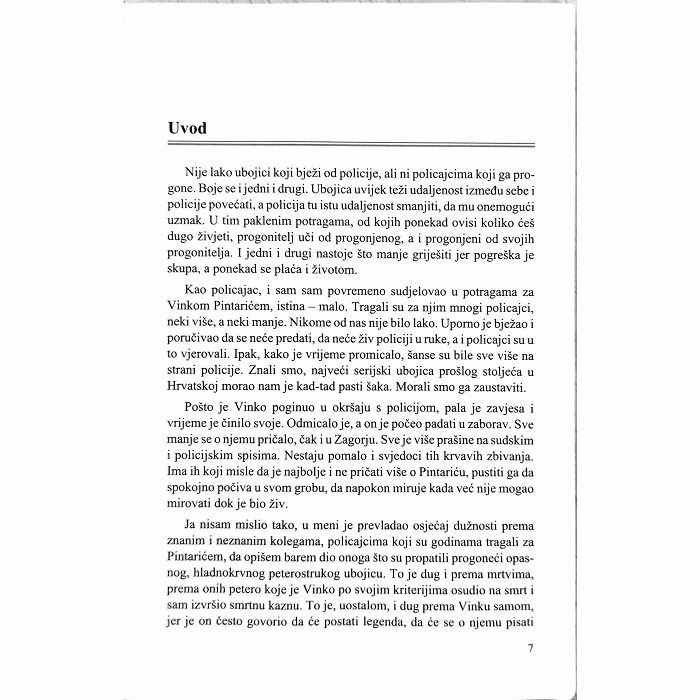 Vinko Pintarić bio je serijski ubojica iz Hrvatske, poznat po svojim zločinima počinjenim u 20. stoljeću. Zbog svojih zločina i bijega od zakona stekao je nadimak "zagorski ubojica stoljeća". Knjiga detaljno opisuje njegov život, zločine i potragu za njim. Naslovnica sadrži dvije fotografije Pintarića, uključujući i policijsku fotografiju (mugshot).