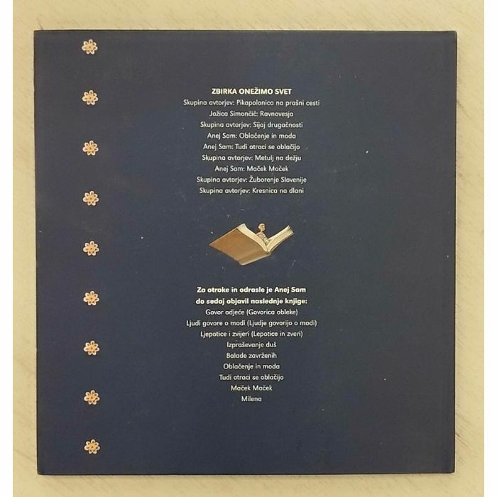 ZBIRKA ONEŽIMO SVET Skupina avtorjev: Pikapolonica na prašni cesti Jožica Simončič: Ravnovesja Skupina avtorjev: Sijaj drugačnosti Anej Sam: Oblačenje in moda Anej Sam: Tudi otroci se oblačijo Skupina avtorjev: Metulj na dežju Anej Sam: Maček Maček Skupina avtorjev: Žuborenje Slovenije Skupina avtorjev: Kresnica na dlani